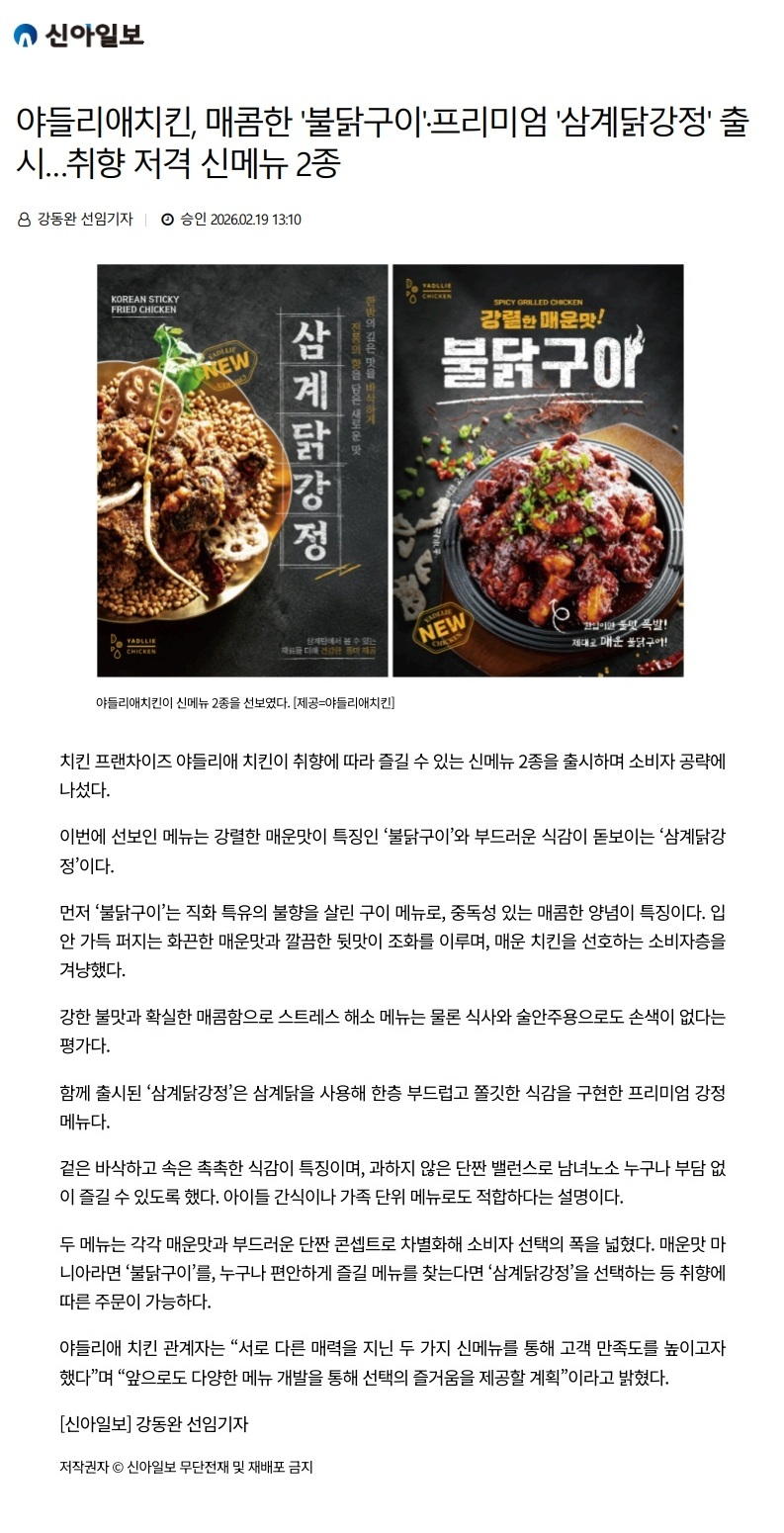 야들리애치킨, 매콤한 ‘불닭구이’·프리미엄 ‘삼계닭강정’ 출시…취향 저격 신메뉴 2종 야들리애 야들리애치킨, 매콤한 ‘불닭구이’·프리미엄 ‘삼계닭강정’ 출시…취향 저격 신메뉴 2종 2026-02-19 *기사출처: https://www.shinailbo.co.kr/news/articleView.html?idxno=2192766 목록보기 jkglobal2026-02-20T10:59:32+09:00