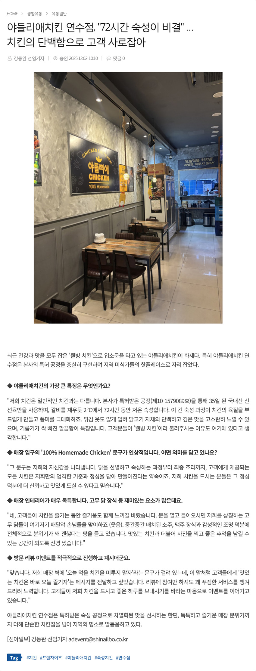 야들리애치킨 연수점, “72시간 숙성이 비결” … 치킨의 단백함으로 고객 사로잡아